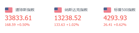 昨夜道指涨168.59点,涨幅为0.50%,报33833.61点;纳指涨133.63点,涨幅为1.02%,报13238.52点;标普500指数涨26.41点,涨幅为0.62%,报4293.93点。特斯拉涨超4%,再创两年多最长连涨日,英伟达终结四连跌,苹果发布MR头显后首次上涨,小盘股指回落,GME跌18%。