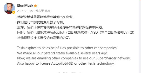 马斯克发布微博表示,特斯拉希望尽可能地帮助其他汽车企业。 我们在几年前就免费开放了专利。 现在,我们正在向其他车辆开放使用特斯拉的超级充电网络。 同时,我们也很乐意将Autopilot(自动辅助驾驶)/FSD(完全自动驾驶能力)或其他特斯拉技术授权给有需要的公司。