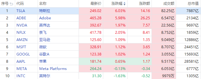 明星科技股方面,Adobe涨近6%,公司为企业推出了一款生成式AI工具Sensei GenAI。奈飞、英伟达续升超2%,谷歌涨近1%,微软、苹果微涨。