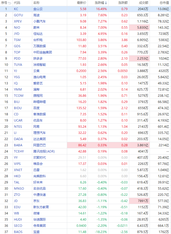 盘前上,金山云大涨16.49%报5.58美元每股,公司此前推出“WPS AI”;高途涨7.6%,蔚来绩后涨7%报8.34美元每股,成交额5.83亿美元;小鹏汽车跟涨逾7%,理想汽车涨0.62%。