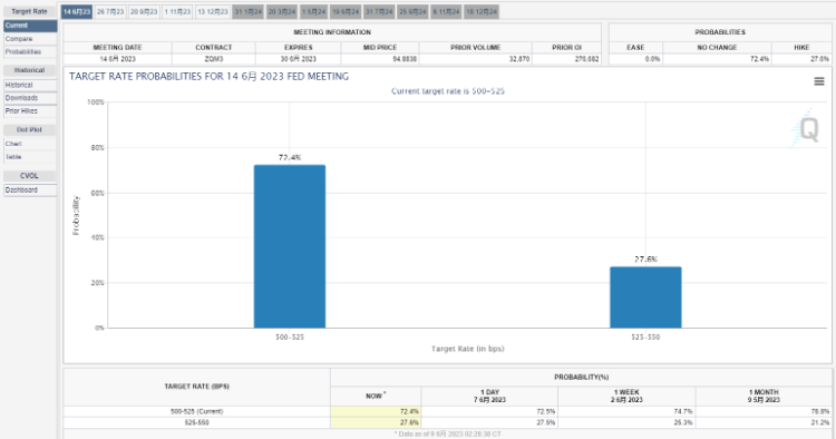 - 美联储6月暂停加息概率达72.4%