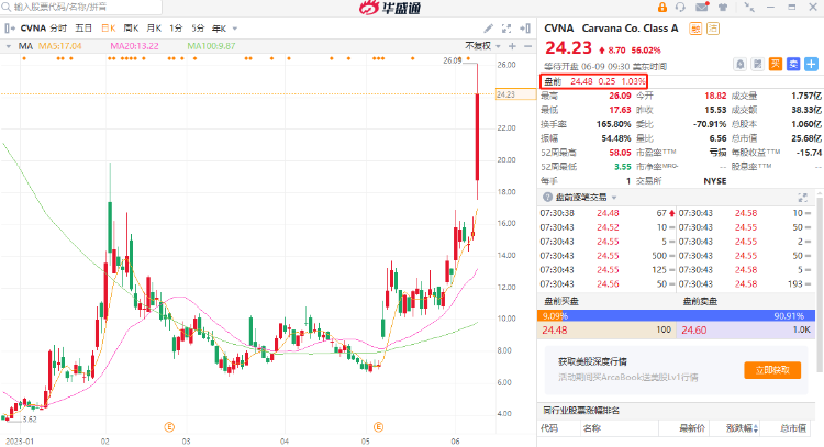 美国最大在线二手车经销商Carvana盘前再升1%,该股周四暴涨56%,收于24.23美元,今年迄今上涨了411%。根据S3 Partners的数据,这使押注该股下跌的投资者今年按市价计算的损失超过了10亿美元,其中包括周四一夜之间损失的约4亿美元。