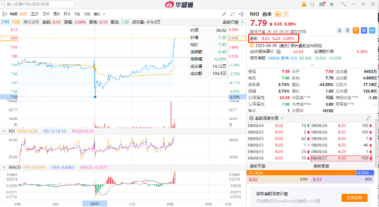 蔚来Q1收入106.765亿元,同比增加7.7%,连续4个季度破百亿。汽车销售额92.245亿元,汽车毛利率5.1%。公司预计二季度营收、交付量均下降。截至发稿,蔚来盘前一度跌逾6%,现涨3.08%报8.03美元每股。