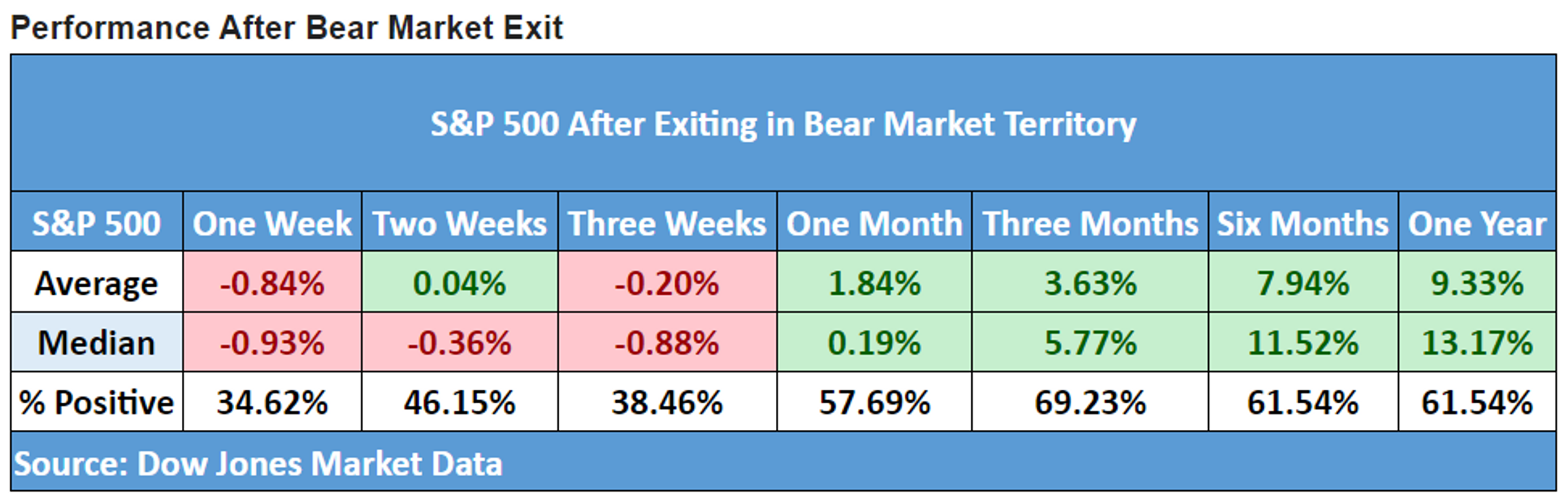 那么,以史为鉴,在标普500指数退出熊市之后会发生什么呢?道琼斯市场数据公司根据可追溯至1929年的数据,对该指数在过去退出熊市后的中值和平均表现进行了观察,结果显示,其表现在之后一个月到一年的时间里基本上是积极的(见下表)。