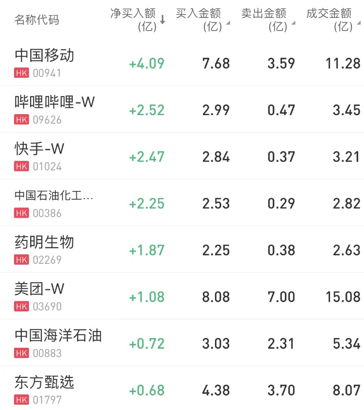 盈富基金、南方恒生科技、建设银行分别遭净卖出27.67亿港元、2.83亿港元、2.22亿港元;南下资金已连续25日净卖出建设银行,累计约96.2423亿港元。中国移动逆势获净买入4.09亿港元。