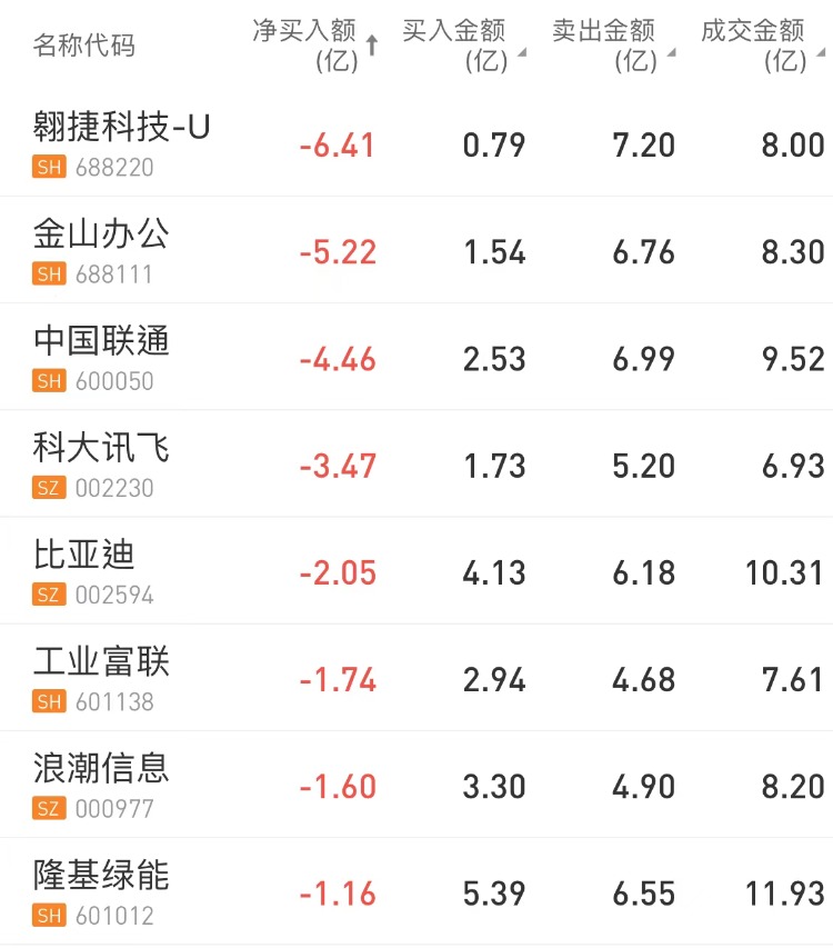 北向资金合计净卖出14.42亿元,其中沪股通净卖出4.13亿元,深股通净卖出10.29亿元。翱捷科技、金山办公、中国联通分别获净卖出6.41亿元、5.22亿元、4.46亿元。中国太保净买入额居首,金额为9.69亿元。