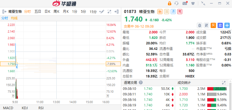 华盛资讯6月12日消息,维亚生物高开后重挫逾8%,截至发稿,跌8.42%,报1.74港元,成交额2171万港元。