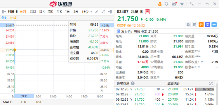 华盛资讯6月12日讯,科笛-B今日挂牌港股上市,截至发稿,低开0.46%,报21.75港元,成交额2105万港元,最新总市值66.13亿港元。
