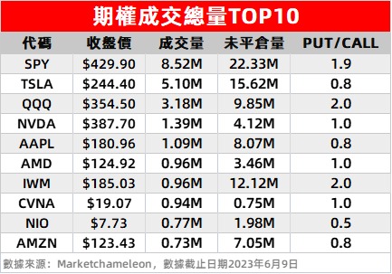 3、蔚来在周五盘中一度涨幅达12%,随后回吐涨幅,最终收跌。但其期权成交量大增158%至77万,进入本榜单第九。