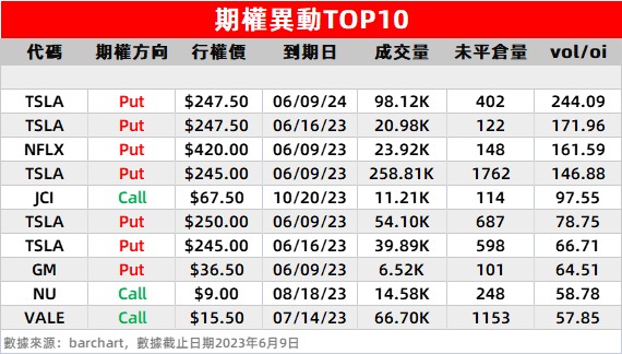 3、继福特之后,另一家老牌汽车巨头通用也宣布下一代电动汽车将采用特斯拉充电标准NACS,特斯拉还承诺将其充电技术整合到通用汽车和福特汽车中。周五时候通用汽车高开低走,盘中涨幅一度至6%,随后持续走低,收盘保住涨幅,最终收涨1%。而在当日到期、行权价在36.5美元看跌期权引得市场追捧。