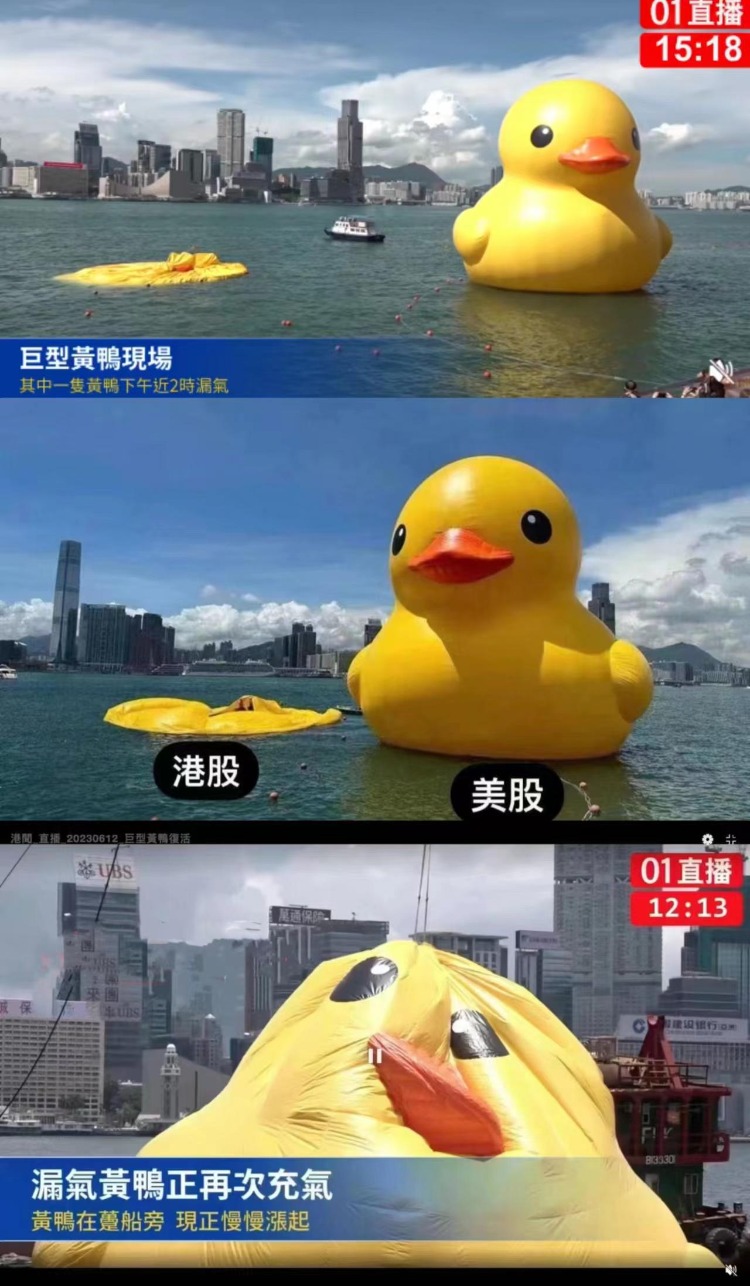 有趣的是,两只鸭子当中的一只在首个亮相的周六就“热爆了”,周六下午两点在一众专程前来打开的粉丝面前漏气,不得已被送去青衣返修。今日,这只鸭子终于重新回中环海边的“工位”,在中环上班的很多打工人也目睹了鸭子从“无气无力”到“支棱起来”的全过程,用影像记录并默默鼓励“加油鸭”。