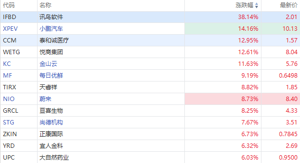 其他中概股,讯鸟软件涨超38%,每日优鲜涨超9%,陆金所涨超6%,斗鱼涨超5%,台积电、高途等涨超2%。