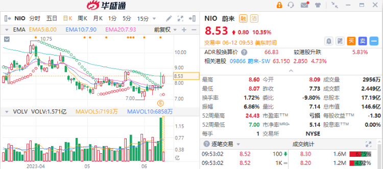 蔚来涨超10%,今日宣布全系车型降价3万元,至此,蔚来车型起售价下探至22.8万元起。