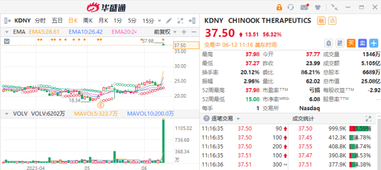 瑞士制药巨头诺华制药计划以高达35亿美元的价格收购生物制药公司Chinook Therapeutics $KDNY ,截至发稿,该股上涨超56%,报37.5美元。