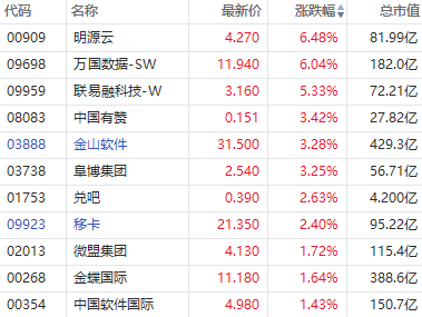 华盛资讯6月13日消息,港股SaaS概念股快速拉升,截至发稿,明源云、万国数据-W涨超6%,联易融科技涨超5%,中国有赞、金山软件、阜博集团涨超3%,移卡涨超2%,微盟集团、金蝶国际等涨超1%。