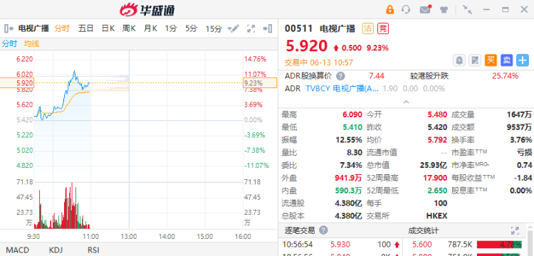 电视广播早盘走强,盘中一度涨超12%,截至发稿,涨9.23%,报5.92港元,成交额9537万港元。