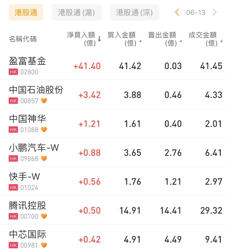 盈富基金、中国石油股份、中国神华今日分别获南向资金净买入41.40亿港元、3.42亿港元、1.21亿港元。
