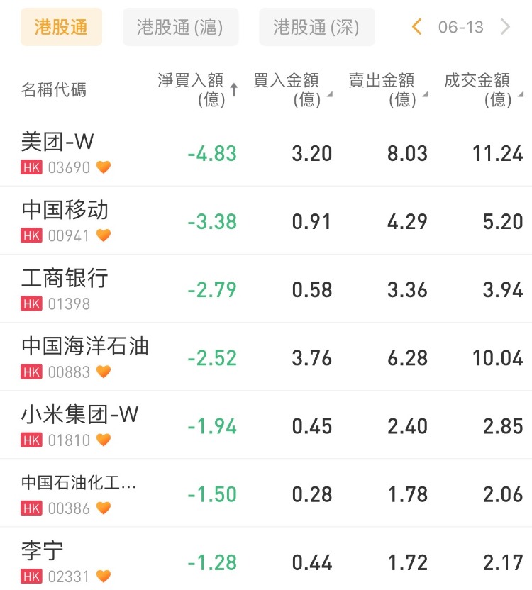 美团-W、中国移动、工商银行遭沽出4.83亿港元、3.38亿港元、2.79亿港元。