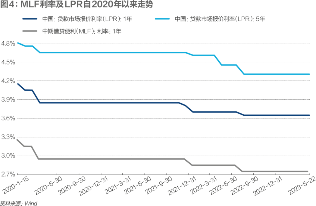 2022年8月央行超预期降息10BP以来,MLF利率连续十个月维持在2.75%,LPR则保持未变。今年3月,央行进一步降准0.25个百分点,释放长期资金超5000亿元。此外,央行持续通过各类结构性货币政策工具提供流动性。