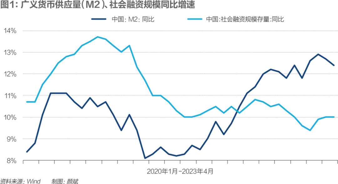 实际上,M2与M1增速也出现一定程度背离。2022年4月-2023年4月,M1增速在3.7%-6.7%之间徘徊,与M2之间的增速差一度扩大至8.1个百分点。