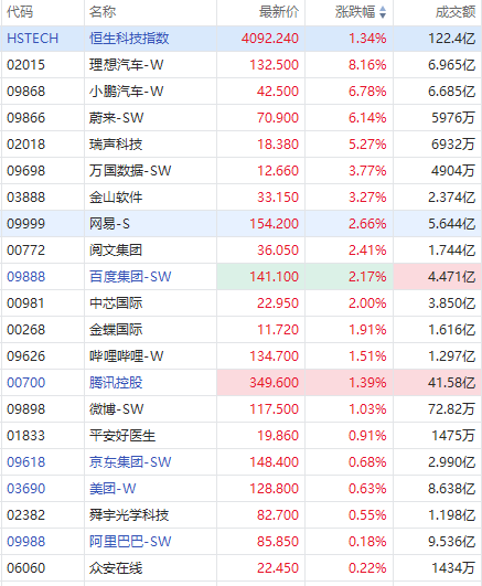 个股方面,理想汽车涨超8%,小鹏汽车、蔚来涨超6%,瑞声科技涨超5%,万国数据、金山软件涨超3%,网易、阅文、百度涨超2%,金蝶国际、腾讯、微博涨超1%,平安好医生、京东、阿里巴巴、众安在线跟涨。