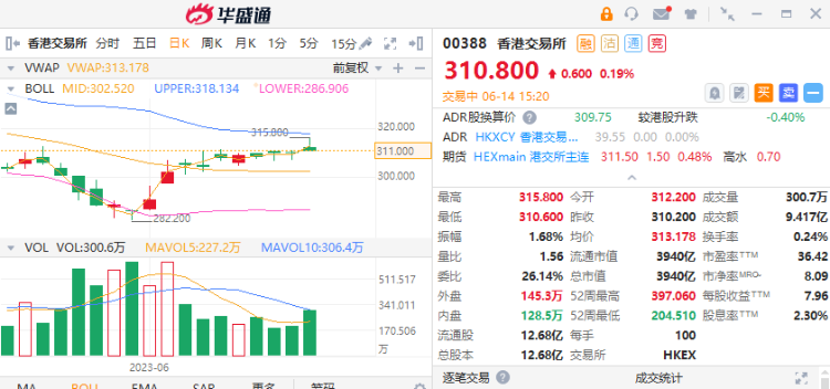 港交所(388)6月19日推出「港币–人民币双柜台模式」。港交所主席史美伦表示,对双柜台业务有很大信心。她表示,交易所下一步将推动港股南向通增设人民币股票交易。港交所今早曾触315.8港元,股价升越十天及二十天平均线。如看好港交所新发展,有利提振股价表现,可留意购证17099 $17099.HK ,行使价360港元,2023年12月到期,实际杠杆8.5倍。