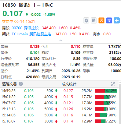 腾讯认购证16850,行使价410.18港元,2023年10月到期,实际杠杆8.5倍。
