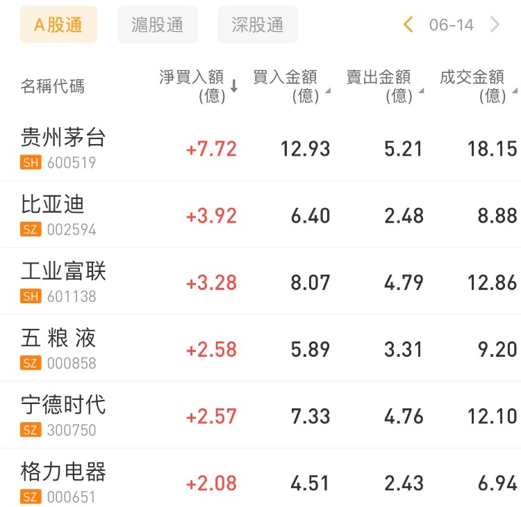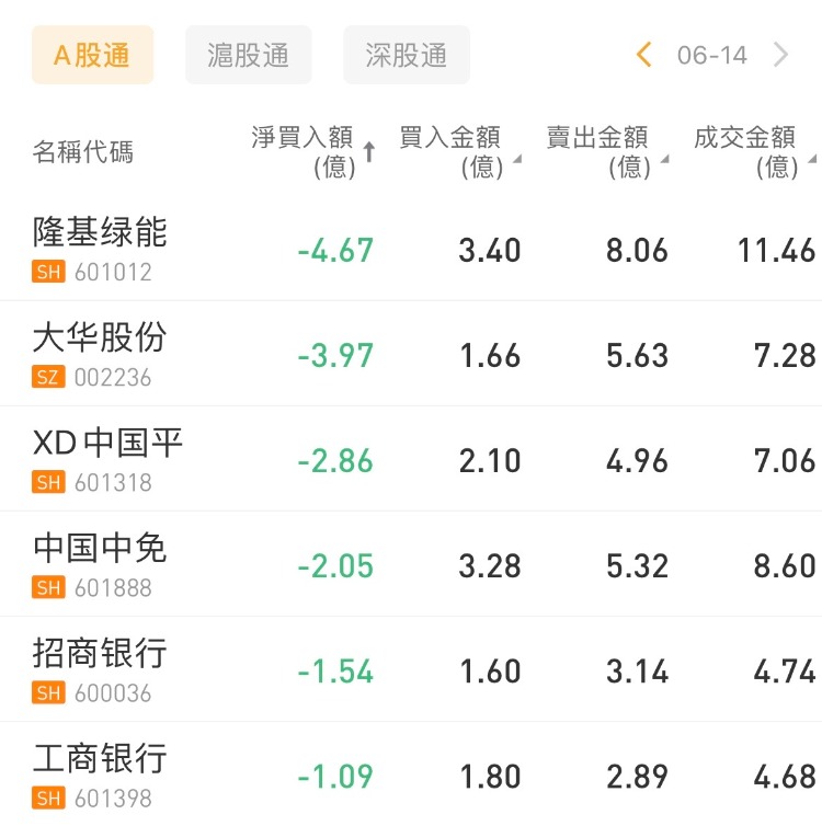 华盛资讯6月14日讯,南向资金今日净买入15.49亿港元,其中港股通(沪)净买入6.74亿港元,港股通(深)净买入8.76亿港元。 北向资金今日净卖出21.94亿元。