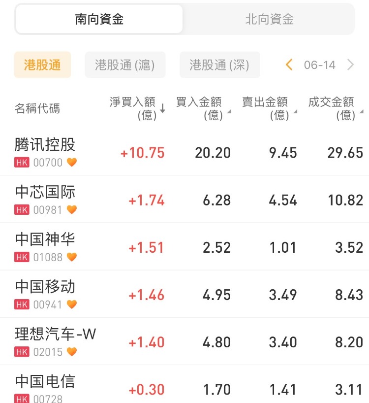 腾讯控股、中芯国际、中国神华今日分别获南向资金净买入10.75亿港元、1.74亿港元、1.51亿港元。