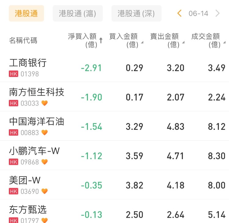 工商银行、中国海洋石油、小鹏汽车-W遭甩卖2.91亿港元、1.54亿港元、1.12亿港元。