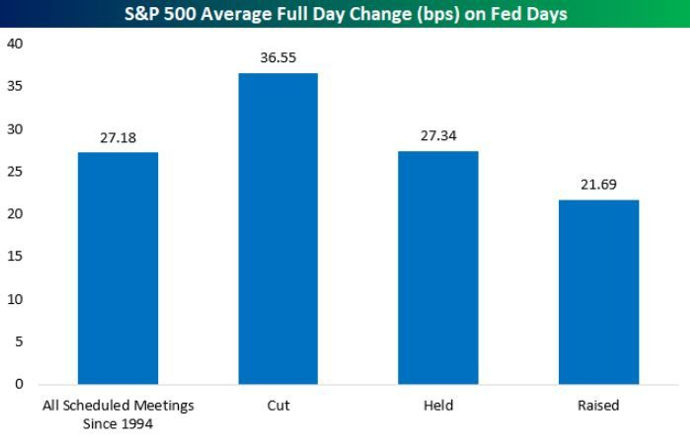 但从更长的时间来看,无论借贷成本是上调、下调还是保持不变,美股在美联储决议日往往会攀升。Bespoke是从1994年开始分析的,那一年时任美联储主席格林斯潘决定开始在会议当天宣布政策决定。