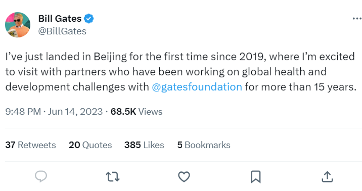 微软创始人比尔·盖茨6月14日在推特发文称已抵达北京,这是他自2019年以来首次抵达北京,很高兴能与盖茨基金会一同应对全球健康和发展挑战的伙伴们会面。