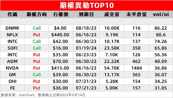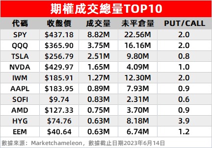 3、AMD收高2.25%,在6月14日AMD在旧金山的发布会上推出了新一代AI芯片、数据中心CPU以及DPU。在生成式AI浪潮之下,最受关注的新品莫过于AI芯片Instinct MI 300X,直接对标英伟达H100。期权成交量较上一日回落39%至75万张。
