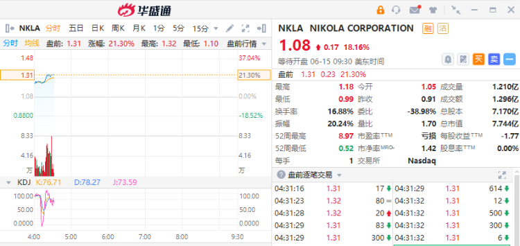 新能源汽车生产商Nikola $NKLA 盘前涨超21%,有望实现七连涨,本月累计涨超70%。