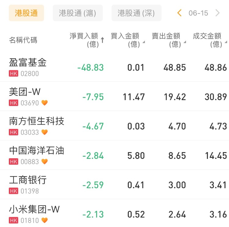盈富基金、美团-W、中海油遭沽出48.83亿港元、7.95亿港元、2.84亿港元。