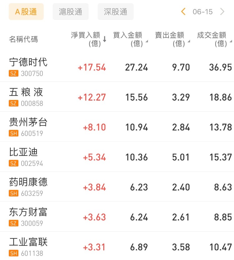 北向资金今日大幅净买入92.01亿元。宁德时代、五粮液、贵州茅台分别获净买入17.54亿元、12.27亿元、8.1亿元。隆基绿能净卖出额居首,金额为6.62亿元。