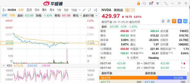 据SEC披露的文件显示,英伟达董事Harvey Jones于6月13日减持119795股,价值4829.7万美元。截至发稿,英伟达盘前跌超1%,报423.88美元。