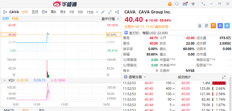 华盛资讯6月15日消息,地中海快餐连锁店Cava $CAVA 今日登陆纳斯达克市场,IPO首日开盘报42美元,盘中涨幅一度扩大至102.27%,暂成交2.03亿美元,此前给出的IPO发行价为每股22美元。