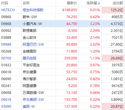 个股方面,蔚来涨超6%,小鹏汽车涨超3%,联想集团、金山软件、阿里巴巴涨超2%,金蝶国际、腾讯涨超1%,平安好医生、阿里健康、京东、美团小幅走高。