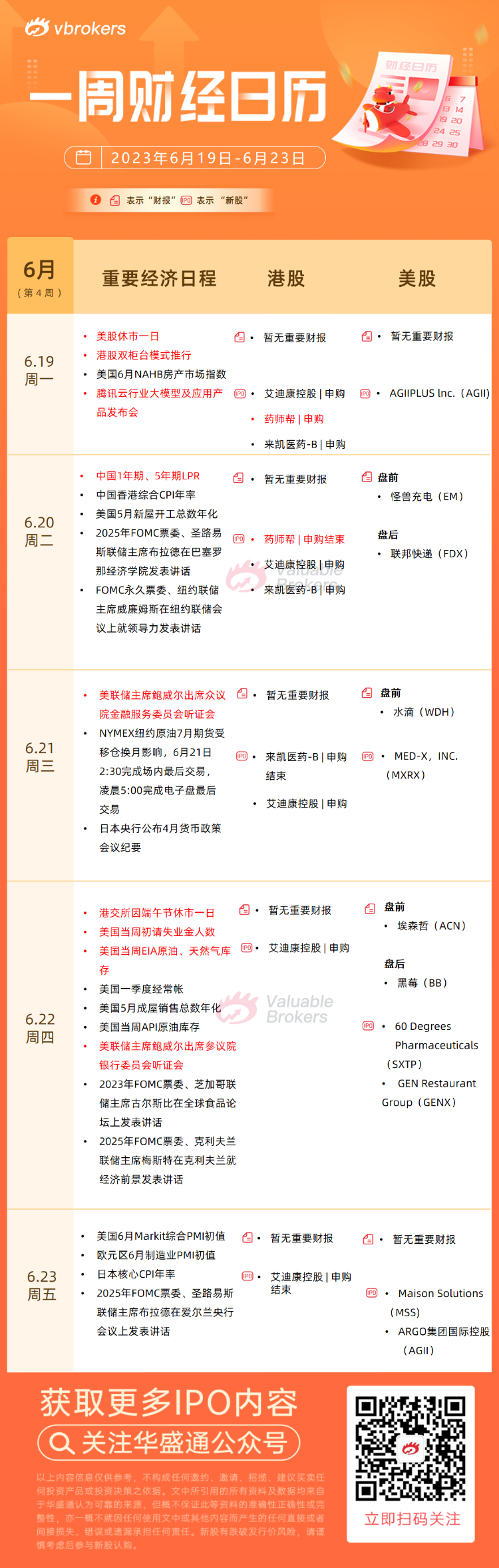 港股方面,本周有3只新股正在招股。冲刺“院外医药产业互联第一股”的药师帮将于6月20日(周二)结束招股,2022年公司GMV达378亿元,占中国院外数字化医药流通服务市场21%的份额。发售价为每股19-23港元,一手入场费4646.39港元。