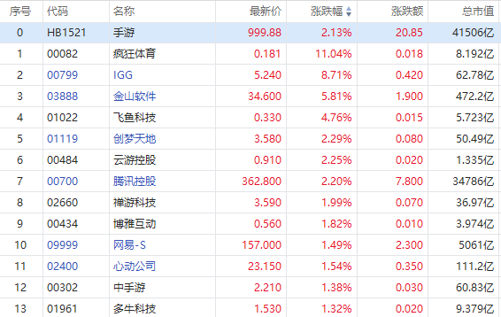 华盛资讯6月16日消息,港股手游股午后持续走强,截至发稿,IGG涨近9%,金山软件涨近6%,飞鱼科技涨近5%,创梦天地、云游控股、腾讯涨超2%,网易、心动公司、中手游跟涨。