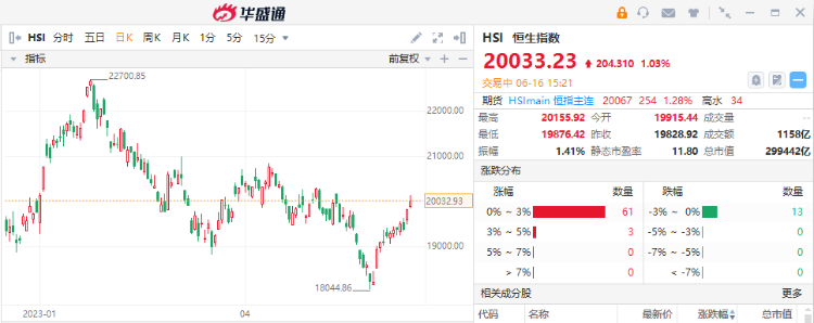 伴随着近日港股逐步反弹,恒生指数从5月31日低位的18044.86点升至今日盘中的20000点上方,期间涨幅达到8.14%。截至发稿,恒生指数涨1.42%,报20112.73点。