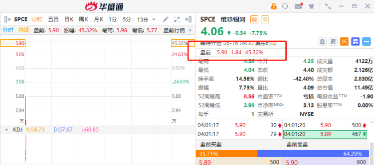 维珍银河 $SPCE 盘前飙升45%,现报5.9美元。当地时间周四,维珍银河宣布,最快将于6月27日执行首次商务载客太空飞行任务,这对于英国富豪理查德·布兰森( Richard Branson)创办的有近20年历史的公司来说是一个重大突破。目前,维珍银河已经售出数百张太空旅行票,每位乘客需要支付45万美元(约合人民币322万元),整个旅程时长90分钟。