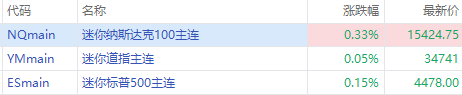 周五美股盘前,美股三大股指期货小幅走高,纳指期货 $NQmain 现涨0.33%,标普500指数期货 $ESmain 涨0.15%,道指期货 $YMmain 涨0.05%。