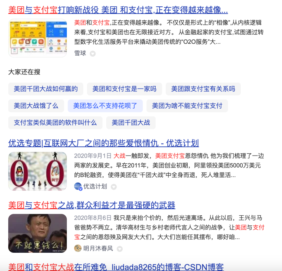 这件事情为什么值得说道呢?因为美团和支付宝曾是“宿敌”,当年美团想做支付做钱包做金融,支付宝也在布局本地生活等高频消费场景,逐渐侵入美团腹地。2020年双方关系更是剑拔弩张,从当年的一些新闻就能一窥端倪: