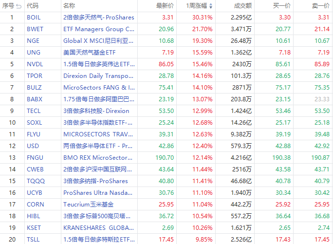 从美股ETF涨幅榜来看,本周做多天然气ETF均录得不错的涨幅,2倍做多天然气ETF $BOIL 周涨30.31%,美国天然气基金ETF $UNG 周涨15.59%。