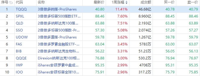此外,本周做多半导体ETF占据涨幅榜前列,3倍做多半导体指数ETF $SOXL 周涨12.68%,两倍做多半导体ETF $USD 周涨12.4%。