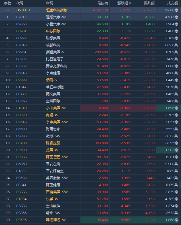 科网股普跌,哔哩哔哩跌超5%、百度跌超3%、阿里巴巴、腾讯控股、美团、京东均跌超2%。