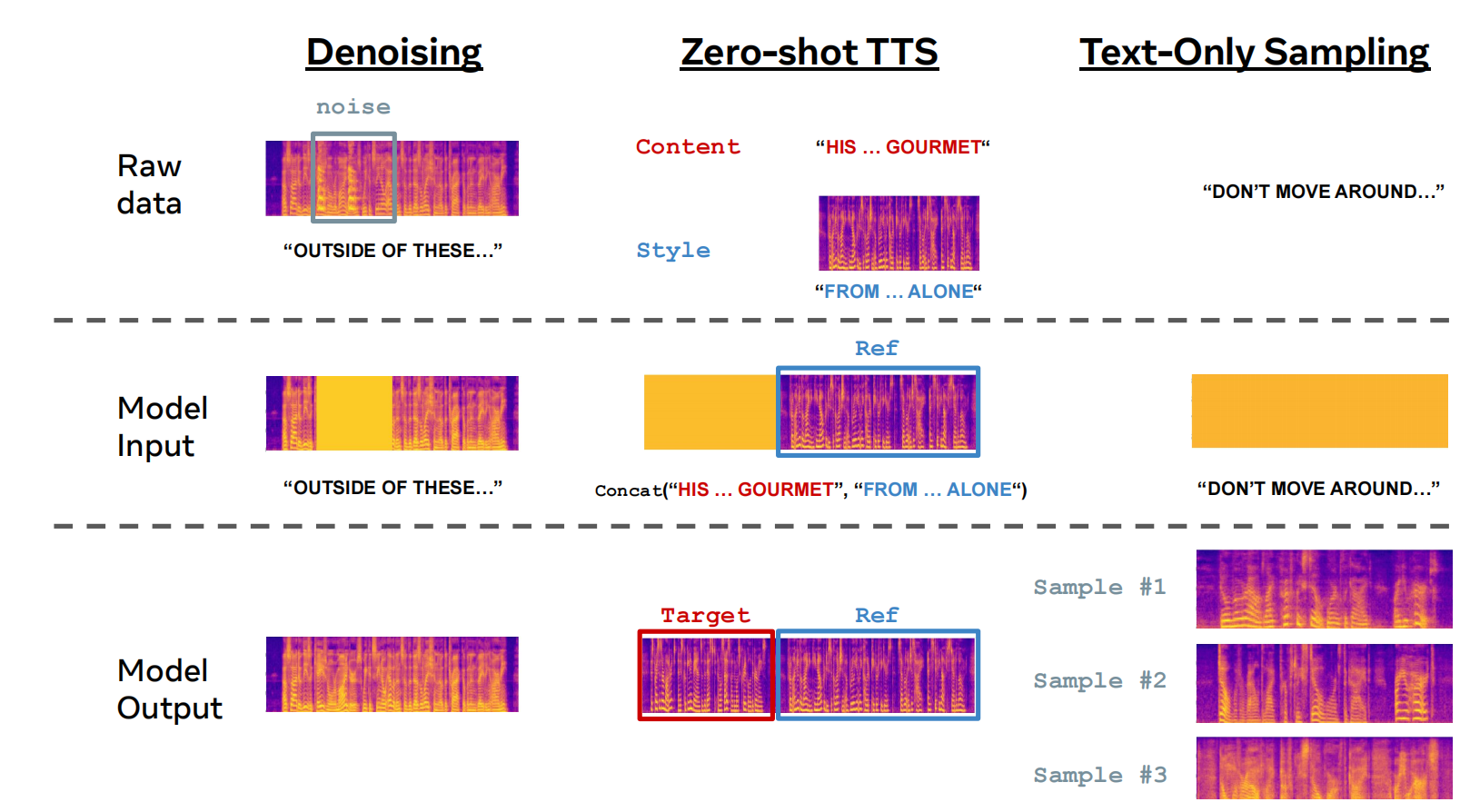 在训练过程中,Voicebox会得到一个音频样本和相应的文本,然后部分音频将被屏蔽,该模型需要根据前后音频和给定的文本,生成被屏蔽的音频片段。