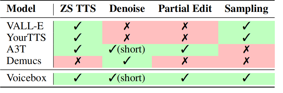 经过这种训练的模型可以直接或在少量微调后,适用于许多任务。以降噪和语音错误修改为例,Voicebox在实现这两项看似不同的功能时,均是首先屏蔽出现噪音或错误的部分,然后基于前后已有的音频和原文本或修改后的文本,重新生成该部分语音。